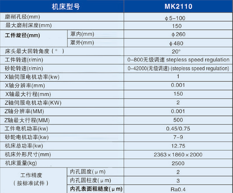 ●本機床為二軸(X軸、Z軸)數(shù)控內圓磨床,主要用于磨削工件的內圓孔、臺階孔、內端面、外端面。磨削循環(huán)均自動完成(具有自動進刀、退刀、粗磨、精磨;自動修正砂輪、自動補償?shù)裙δ?。