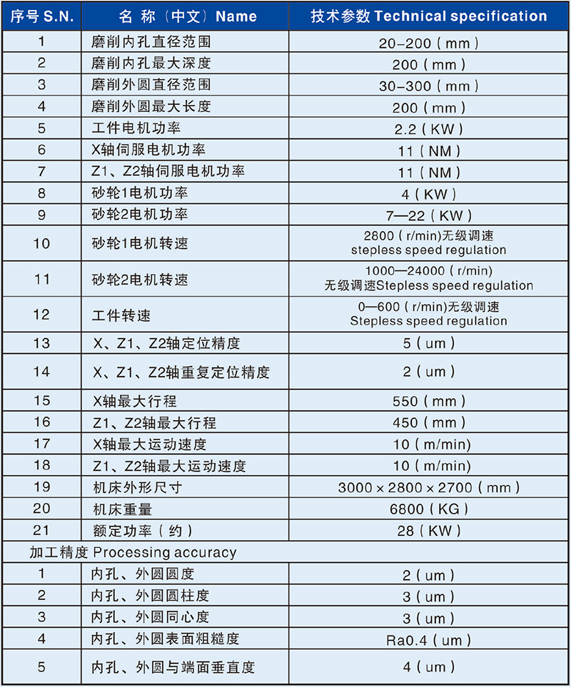 ●本機(jī)床為三軸(X進(jìn)給、Z1砂輪、Z2砂輪軸)二聯(lián)動(dòng)數(shù)控復(fù)合磨床,主要用于磨削工件的內(nèi)圓孔、內(nèi)錐孔、臺(tái)階孔、內(nèi)端面、外圓、外端面。磨削循環(huán)均自動(dòng)完成(具有自動(dòng)進(jìn)刀、退刀、粗磨、精磨;自動(dòng)修正砂輪、自動(dòng)補(bǔ)償?shù)裙δ?。