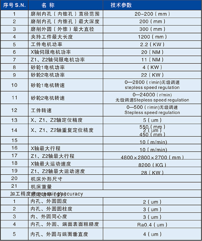 ● 本機(jī)床為三軸(X工件橫向進(jìn)給、Z1、Z2砂輪縱向運(yùn)動(dòng))二聯(lián)動(dòng)套筒及主軸專用數(shù)控磨床,主要用于磨削各類主軸及套筒的內(nèi)孔、內(nèi)錐孔、內(nèi)端面、外圓、外錐面、外端面。磨削循環(huán)均自動(dòng)完成(具有自動(dòng)進(jìn)刀、退刀、粗磨、精磨;自動(dòng)修正砂輪、自動(dòng)補(bǔ)償?shù)裙δ?。