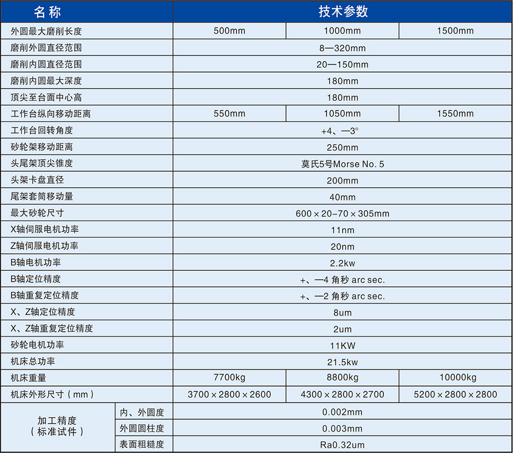 ● 本機床為三軸(砂輪架橫向進給X軸、工作臺縱向運動Z軸、砂輪架底座分度回轉(zhuǎn)B軸)二聯(lián)動數(shù)控萬.能外圓磨床,數(shù)控系統(tǒng)采用國際或國內(nèi)知名品牌。具有自動進刀、退刀、粗磨、精磨,修正砂輪,自動補償、砂輪架自動回轉(zhuǎn)等功能,加配自動測量儀,能實現(xiàn)磨削循環(huán)功能的全閉環(huán)。