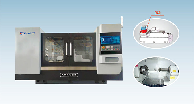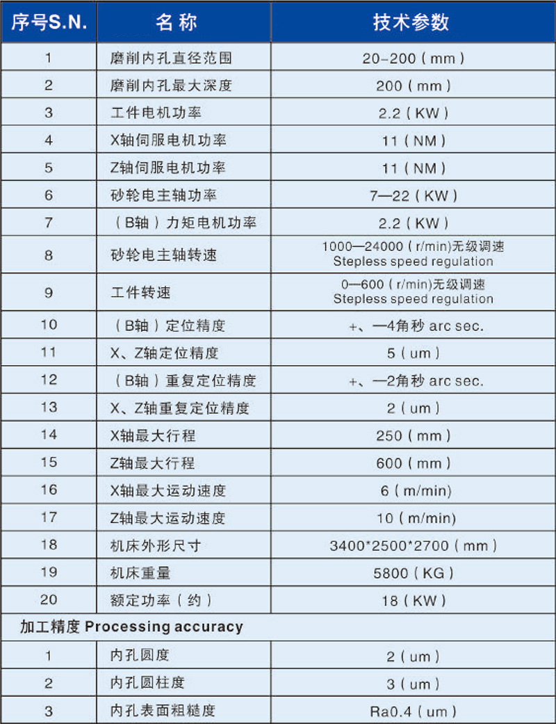 ●本機(jī)床為三軸(X進(jìn)給、Z砂輪、B分度軸)數(shù)控內(nèi)圓磨床,主要用于磨削工件的內(nèi)圓孔、內(nèi)錐孔、內(nèi)端面、外端面的磨削。磨削循環(huán)均自動(dòng)完成(具有自動(dòng)進(jìn)刀、退刀、粗磨、精磨;自動(dòng)修正砂輪、自動(dòng)補(bǔ)償?shù)裙δ埽?br /> ●機(jī)床采用工件進(jìn)給,B軸分度(力矩轉(zhuǎn)臺(tái)),工作臺(tái)(砂輪架)左右運(yùn)動(dòng)的結(jié)構(gòu)方式,工件箱進(jìn)給及砂輪架運(yùn)動(dòng)導(dǎo)軌均為滾動(dòng)直線導(dǎo)軌,均由伺服電機(jī)驅(qū)動(dòng)滾珠絲杠運(yùn)動(dòng),工件主軸及砂輪主軸旋轉(zhuǎn)速度均由變頻器控制,實(shí)現(xiàn)無(wú)級(jí)調(diào)速。工件夾緊為液壓動(dòng)力卡盤(pán),同時(shí)可以根據(jù)用戶(hù)工件的特殊性配置其它相匹配的夾具●機(jī)床為全封閉防護(hù)罩殼,前置回轉(zhuǎn)式操作箱、后置背包式電器柜。