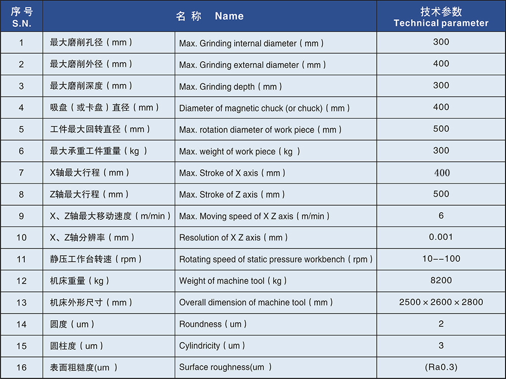 1、本機(jī)床為二軸二聯(lián)動(dòng)數(shù)控立式內(nèi)(或外)圓磨床,能對(duì)零件的內(nèi)(外)圓或臺(tái)階孔等多表面的磨削。